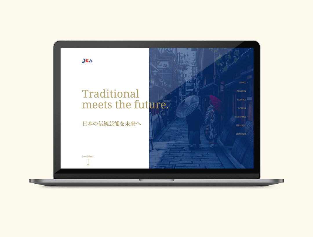 新規のコーポレートサイト作成でした。文化的で厳格な雰囲気のデザイン、かつ1ページに収め、動きを少しつけることを希望していました。